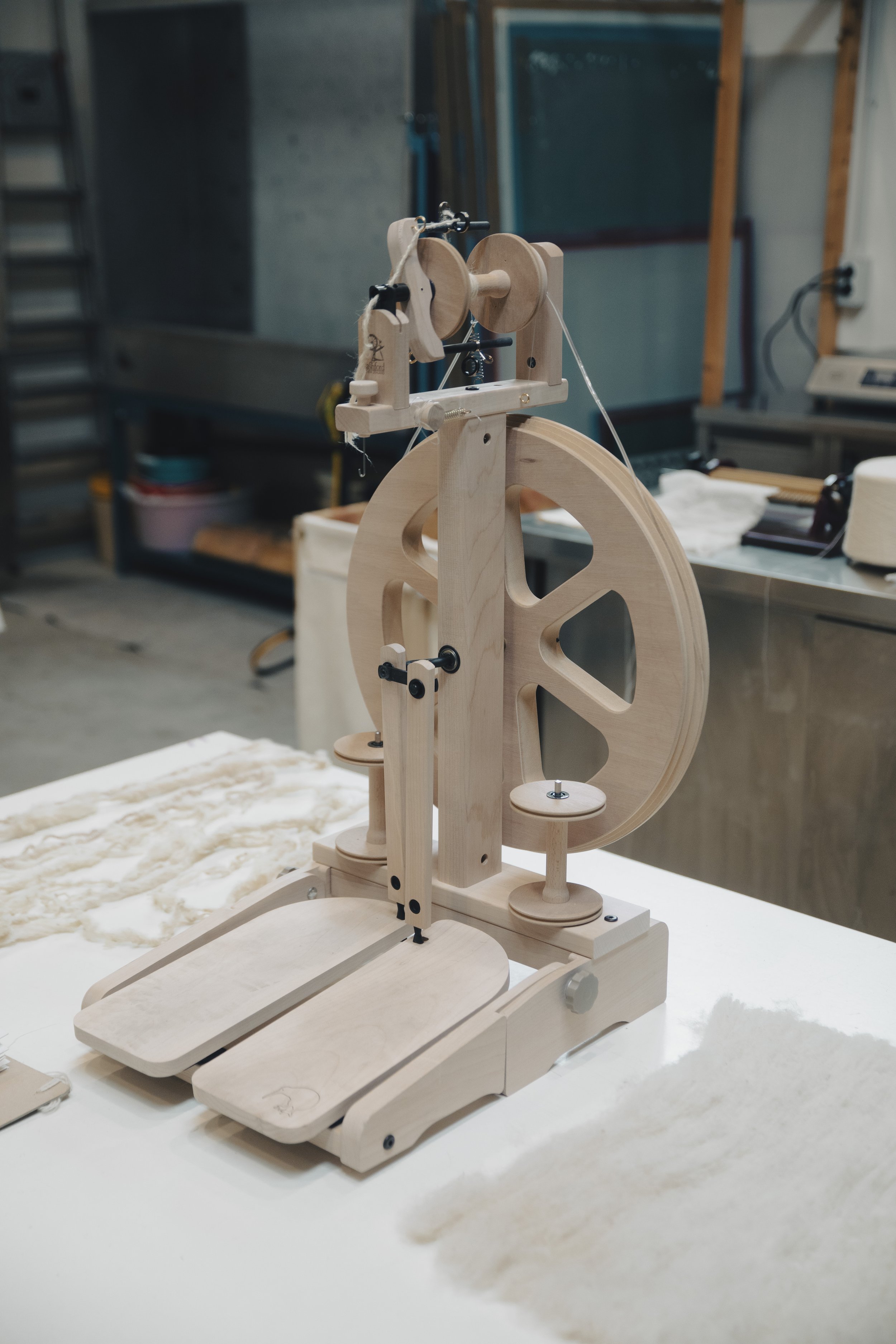 Spin a variety of yarns using the four ratios. The stretchy drive cord does not require any adjustment as you change from one ratio to another and always maintains the correct tension. The wheel and flyer are mounted on ball bearings for effortless spinning. Smooth and quiet with treadles mounted on polyurethane hinges to allow a comfortable heel-toe action.