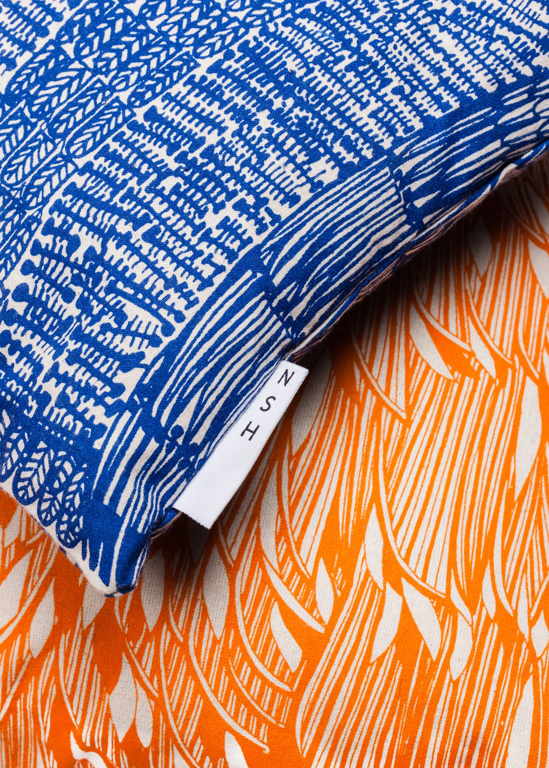NSH: Nasce tutto da un incontro casuale, quello con l’ingegnere tessile Otto Von Aufschnaiter nel suo negozio di filati naturali a Bolzano. È in questa occasione che nel 2012, durante un progetto per la Facoltà di Design e Arti di Bolzano, scopriamo alcune delle stoffe serigrafate realizzate da Handdruck, collettivo che Aufschnaiter fondò nel 1972 assieme a un gruppo di quattro designer e artisti internazionali. Dopo diversi anni in Perù, dove ha potuto approfondire la cultura tessile locale e collaborato con i tessitori di San Pedro de Cajas, alla fine degli anni ‘60 è rientrato in Italia con la moglie ed insieme hanno aperto il loro negozio. Sentivano la necessità di produrre manufatti e tessuti che esprimessero un’identità Altoatesina aggiornata, che raccontasse l’incontro tra due culture, quella italiana e quella mitteleuropea. È da questa condizione che il collettivo Handdruck ha lavorato per più di vent’anni a formare nuove storie locali attraverso le loro opere collaborando con artigiani del vetro, del legno e del tessile. Neue Serie Handdruck si focalizza su quest’ultimo aspetto del loro lavoro e ne ha studiato la produzione di pattern e stampa su stoffa.