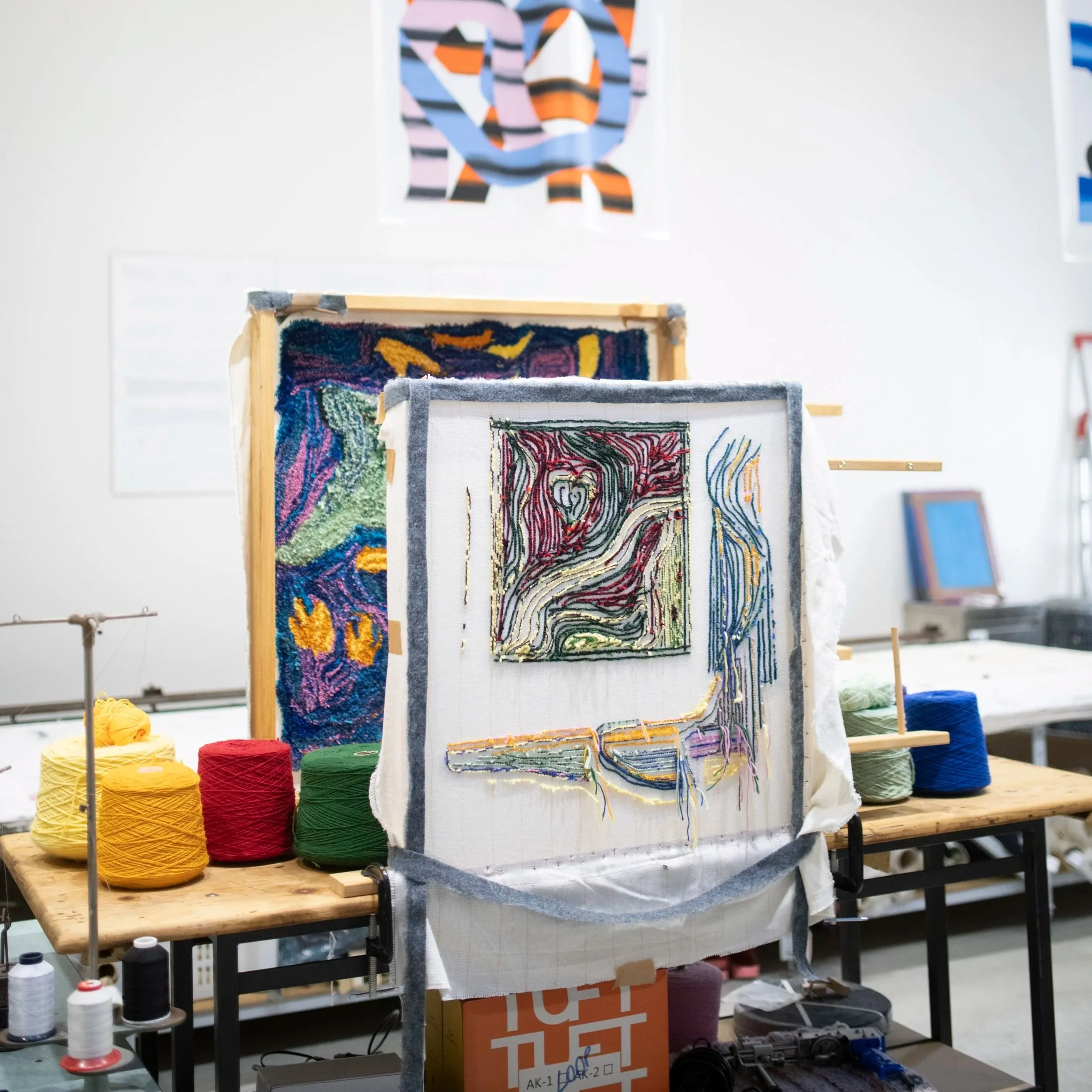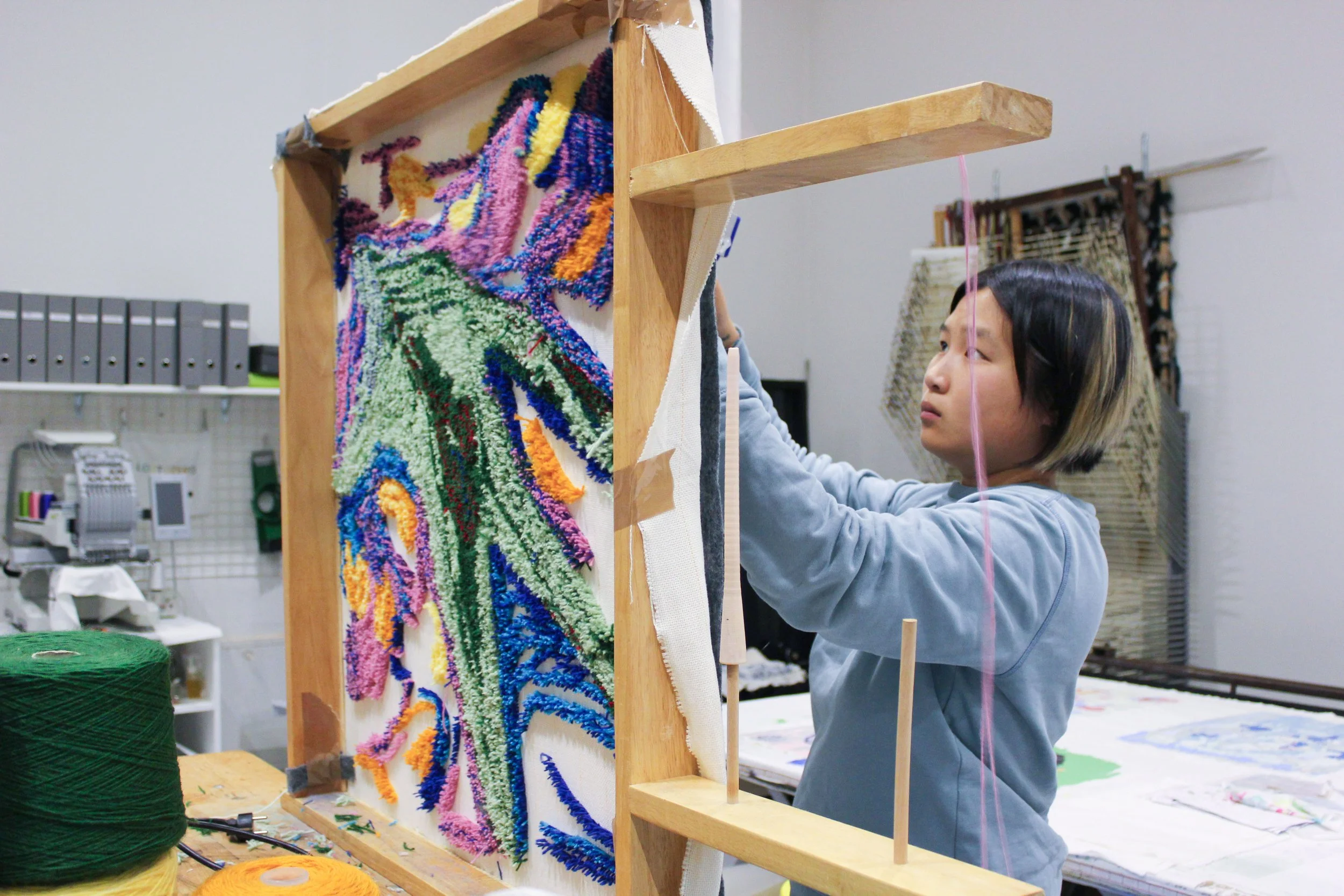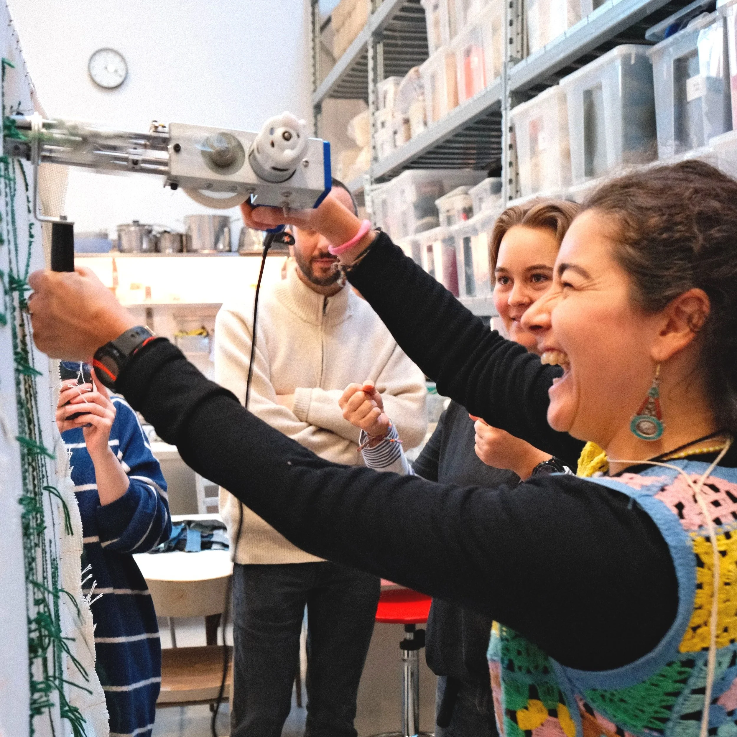 Tufting is a textile technique where yarn is punched through a fabric base to create a raised, textured surface. In our lab, we provide two hand tufting guns (cut and loop pile) along with tufting frames in various sizes, allowing you to create rugs, wall hangings, or other textured textiles.